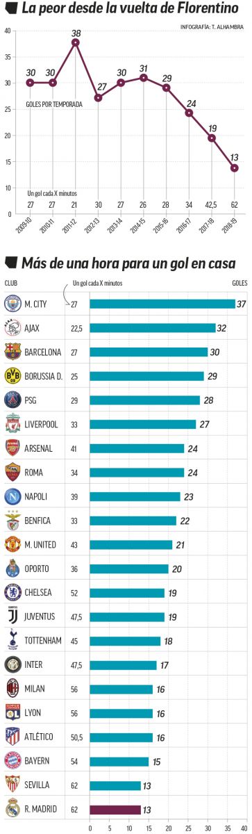 وتؤكد أرقام صحيفة "ماركا" الإسبانية بأن هجوم ريال مدريد فقد فعاليته في المباريات التي تقام على أرضه وامام جماهيره بـ "السانتياغو بيرنابيو" ، بعدما سجل الفريق أدنى رصيد تهديفي له في مسابقة الدوري الإسباني منذ تولي فلورنتينو بيريز رئاسة النادي في موسم (2009-2010).