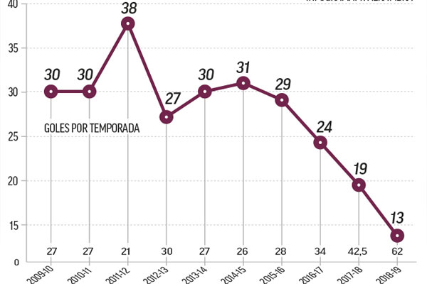 هذا واكتفى ريال مدريد بإحراز 26 هدفاً منها 13 هدفاً فقط على ملعبه بمعدل زمني بلغ هدفا واحدا كل 62 دقيقة بعد مرور 18 مباراة في بطولة الدوري المحلي من الموسم الجاري، بينما نجح خط هجومه بقيادة البرتغالي كريستيانو رونالدو في تسجيل 19 هدفاً بمعدل زمني بلغ هدفا كل 42 دقيقة على ملعبه في ذات البطولة من منافسات الموسم الماضي ، مع الإشارة أيضاً الى أن ريال مدريد كان قد أحرز 24 هدفاً بمعدل هدف كل 34 دقيقة في موسم (2016-2017) الذي شهد تتويجه بلقب الدوري المحلي.