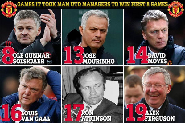 وبحسب تقرير لصحيفة "ذا صن" البريطانية، فإن سولسكاير يتفوق على مورينيو الذي احتاج إلى 13 مباراة ليحقق ثمانية انتصارات ، كما يتفوق على الإسكتلندي دافيد مويز الذي احتاج إلى 14 مباراة ليحقق انتصاره الثامن، كما تفوق على الهولندي لويس فان غال الذي احتاج إلى 16 مباراة ليصل الى الانتصار الثامن، كما تفوق أيضاً على الإنكليزي رون أتكينسون الذي حقق ثمانية انتصارات بعدما خاض 17 مباراة .