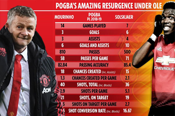 وتكشف ارقام نشرتها صحيفة "ذا صن" البريطانية عن التحول الصاروخي في منحى الأداء الفني لبوغبا تحت إشراف سولسكاير ، مما كان له الأثر الإيجابي على تحقيق الفريق لستة انتصارات وتعادل وحيد خلال المباريات السبع التي لعبها مانشستر يونايتد في بطولة الدوري الإنكليزي، مقارنة مع أدائه و مردوده في المباريات الأربع عشرة الماضية التي لعبها تحت أمرة مورينيو.