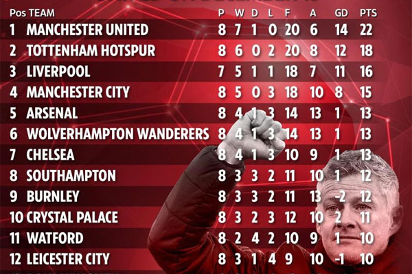 ورغم النتائج المتميزة التي حققها "اليونايتد" مع مدربه النرويجي، إلا ان ترتيبه يبقى متخلفاً، إذ يحتل المركز الخامس بفارق 14 نقطة عن الصدارة و 11 نقطة عن الوصافة و 5 نقاط فقط عن المركز الثالث الذي يتواجد فيه توتنهام هوتسبير، و نقطتين فقط عن المركز الرابع الذي يحتله تشيلسي .