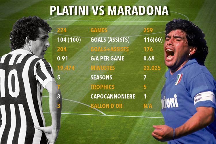 ولم يترك مارادونا غريمه بلاتيني يعلن اعتزاله اللعب في شهر مايو من عام 1987 إلا بعدما ازاحه مع يوفنتوس من عرش الدوري الإيطالي موسم (1986-1987) ، وذلك عندما قاد نابولي لإحراز أول ألقابه في البطولة منذ تأسيس النادي، كما نجح الأرجنتيني في التفوق على الفرنسي على الصعيد الدولي ببطولة كأس العالم ، حيث تمكن مارادونا من قيادة منتخب بلاده لإعتلاء عرش الكرة العالمية عام 1986 ، في وقت عجز بلاتيني عن قيادة منتخب بلاده لما هو افضل من بلوغ المربع الذهبي في مونديالي 1982 و 1986 رغم انه كان على رأس الجيل الذهبي للكرة الفرنسية.