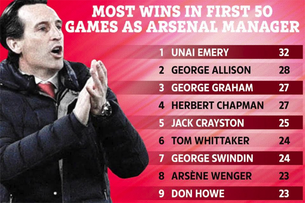 هذا وأصبح إيمري أكثر المدربين تحقيقاً للإنتصارات بعد مرور 50 مباراة منذ تعيينه رئيساً على الجهاز الفني للنادي اللندني ، وذلك في أعقاب الفوز الذي حققه أرسنال على مضيفه نابولي الإيطالي في إياب دور الثمانية من مسابقة الدوري الأوروبي.