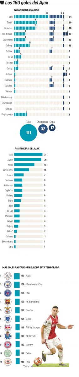 ويكشف تقرير صحيفة "ماركا" الإسبانية بأن أياكس هو الفريق الأكثر تهديفاً بين الأندية الأوروبية في كافة المسابقات الرسمية التي خاضها خلال منافسات الموسم الجاري ، متفوقاً بذلك على أقوى الأندية في "القارة العجوز" رغم إمتلاكها مهاجمين هدافين من الطراز الرفيع.