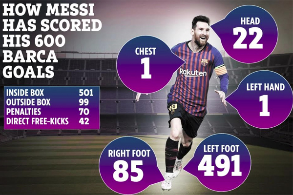 وبحسب صحيفة "ذا صن " البريطانية، فإن ميسي نجح في تسجيل 600 هدف ، بعدما خاض 683 مباراة ، حيث سجل 461 هدفاً بقدمه اليسرى ، مقابل 85 هدفاً بقدمه اليمنى ، كما سجل 22 هدفاً برأسه و هدفاً واحداً بصدره وهدفاً بيده اليسرى.