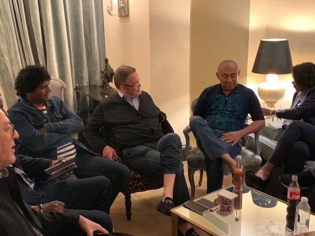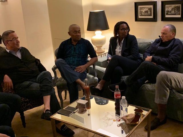 احمد احمد مع أعضاء ال" كاف" وبدا الى جانبه فوزي لقجع رئيس الجامعة الملكية المغربية لكرة القدم خلال لقاء معهم مساء اليوم في باريس عقب إخلال الشرطة الفرنسية سبيله