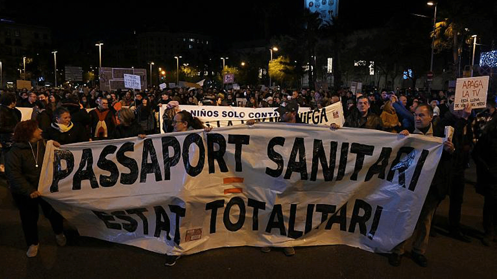 وخلال مسيرة في وسط المدينة الكاتالونية، سار المتظاهرون وراء لافتة كتب عليها بالكاتالونية "التصريح الصحي = دولة شمولية"، حسبما ذكر صحافي في تلفزيون وكالة فرانس برس.