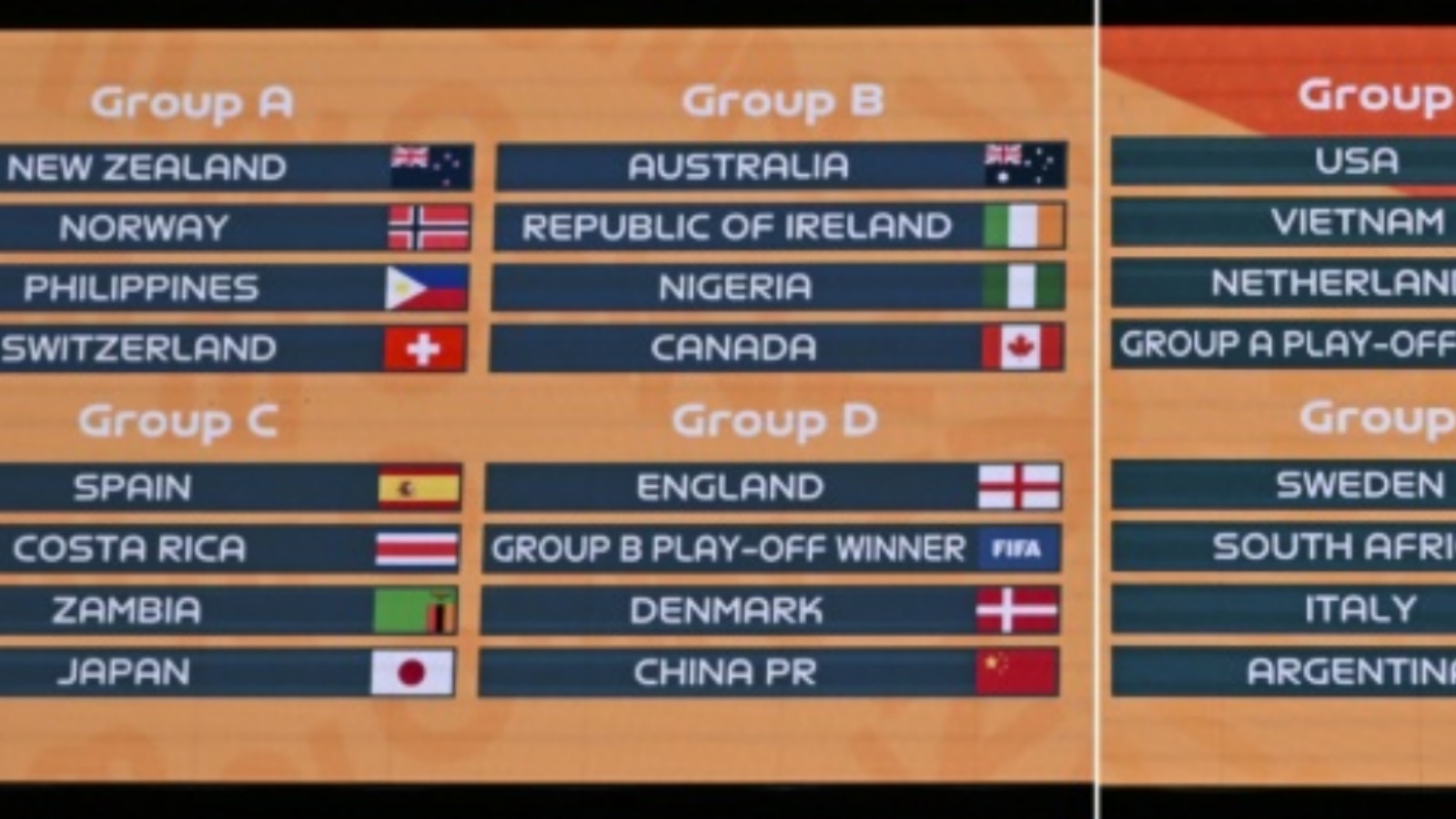 أما المضيفة الثانية أستراليا، فتتواجه في المجموعة الثانية مع جمهورية إيرلندا، نيجيريا وكندا. وضمّت المجموعة السابعة في نيوزيلندا منتخبات السويد، جنوب أفريقيا، إيطاليا والأرجنتين.