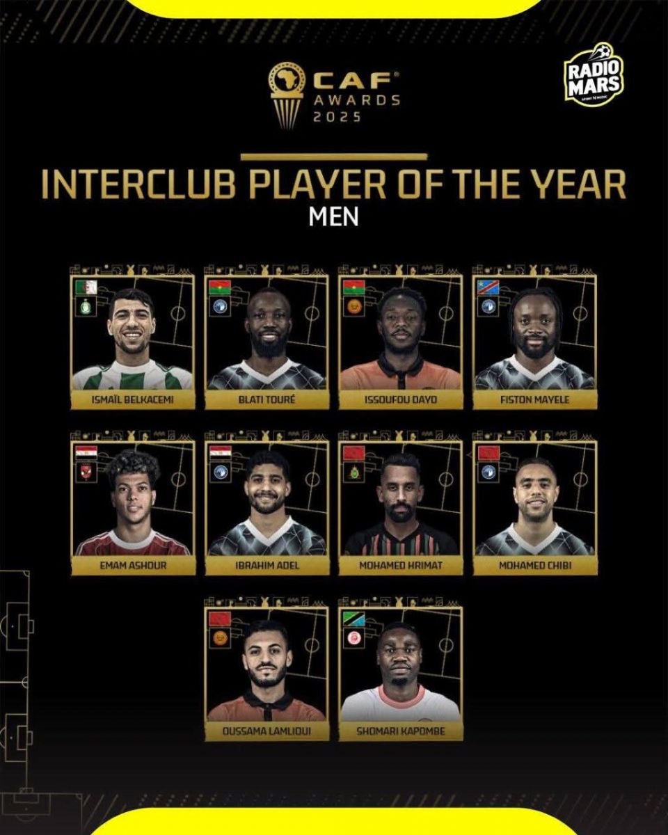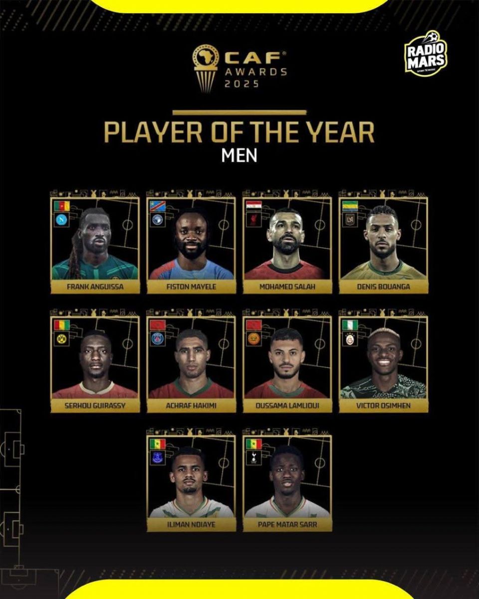 بالنسبة للمرشحين بجائرة أفضل لاعب أفريقي، شهدت القائمة حضور أشرف حكيمي، مدافع باريس سان جيرمان الفرنسي، وأسامة لمليوي، لاعب نهضة بركان، إلى جانب الكاميروني فرانك أنغيسا (نابولي)، والكونغولي فيستون ماييلي (بيراميدز)، والمصري محمد صلاح (ليفربول)، والغابوني دينيس بوانغا (لوس أنجلوس)، والغيني سيرهو غيراسي (بروسيا دورتموند)، والنيجيري فيكتور أوسيمين (غلطة سراي)، والسنغاليان إيليمانندياي (إيفرتون) وباب ماتار سار (توتنهام).