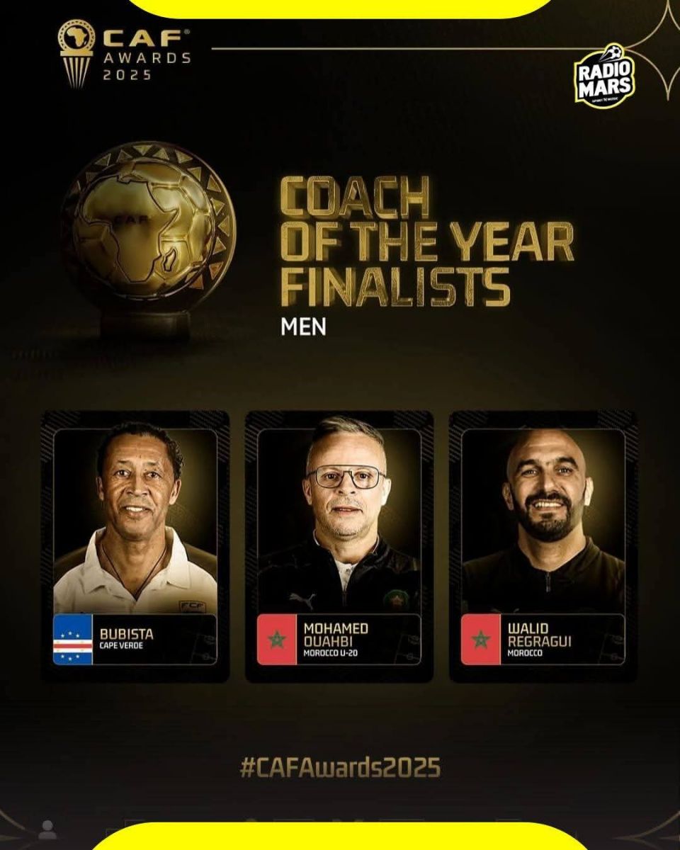 في جائزة أفضل مدرب، شهدت القائمة حضور وليد الركراكي، مدرب المنتخب المغربي الأول، ومحمد وهبي مدرب المنتخب المغربي لأقل من 20 سنة، إلى جانب بوبيستا، مدرب منتخب الرأس الأخضر.