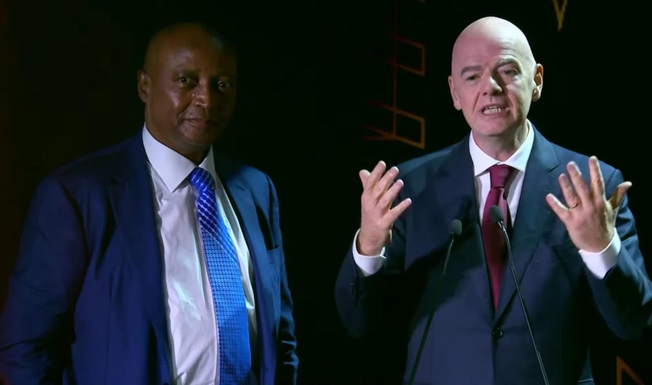 جياني إيفانتينو رئيس الاتحاد الدولي لكرة القدم (فيفا)، يتحدث في الحفل والى جانبه باتريس موتسيبي رئيس الاتحاد الإفريقي لكرة القدم (كاف)