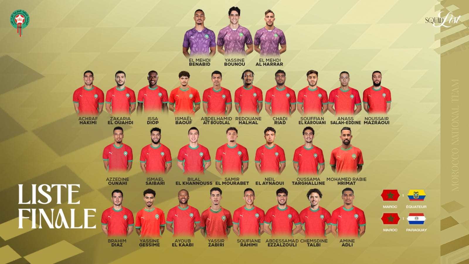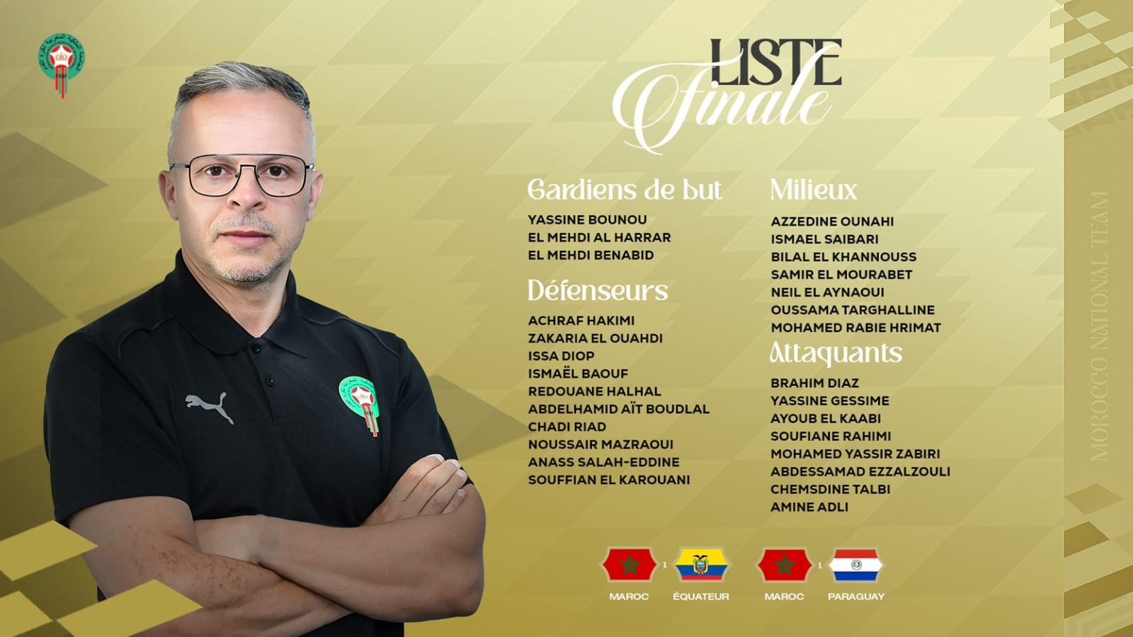 وشهدت اللائحة توجيه الدعوة، في حراسة المرمى لكل من مهدي بعبيد وياسين بونو ومهدي لحرار، وفي خط الدفاع لكل من نصير مزراوي وأنس صلاح الدين وسفيان الكرواني وأشرف حكيمي وزكرياء الواحدي وشادي رياض ورضوان حلحال وعبد الحميد أيت بودلال وعيسى ديوب وإسماعيل باعوف، وفي وسط الميدان لكل من أسامة ترغالين ونائل العيناوي ومحمد ربيع حريمات وسمير المرابطي وعز الدين أوناحي وبلال الخنوس وإسماعيل الصيباري، وفي خط الهجوم كل من عبد الصمد الزلزولي وشمس الدين الطالبي وأمين عدلي وبراهيم دياز وياسين جسيم وأيوب الكعبي وسفيان رحيمي وياسر الزابيري.
