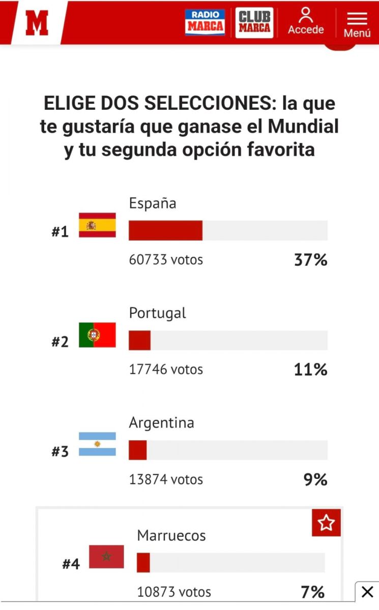 عن السؤال الأول الذي طرحته "ماركا: "اختر منتخبين: المنتخب الذي ترغب في أن يفوز بكأس العالم، وثاني فريق تفضله"، مالت الجماهير إلى المنتخب الإسباني بنسبة 37 بالمائة، متبوعا بالبرتغالي ب11 بالمائة، ثم الأرجنتيني ب9 بالمائة، ثم المغربي ب7 بالمائة، فالبرازيلي خامسا ب6 بالمائة.