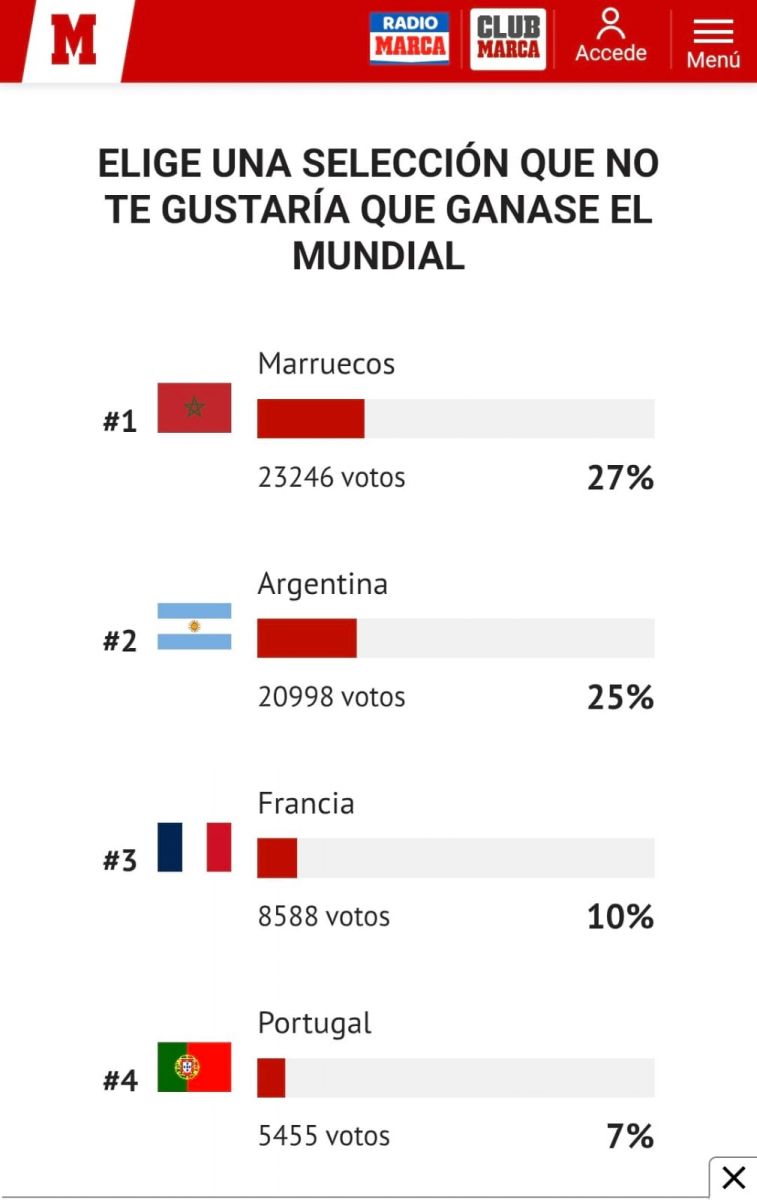 عن سؤال "اختر منتخبًا لا ترغب في أن يفوز بكأس العالم"، جاء المنتخب المغربي في صدارة المنتخبات التي لا يرغب قراء "ماركا" في رؤيته متوجا باللقب العالمي ب27 بالمائة، متبوعا بالمنتخب الأرجنتيني ب25 بالمائة، ثم الفرنسي ثالثا ب10 بالمائة، والبرتغالي رابعا ب7 بالمائة، فالأميركي خامسا ب6 بالمائة.