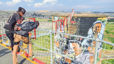 يُفرغ "دي بونغز" علبة طلاء على جدار مواجه لقطعة أرض خالية في وسط جوهانسبرغ المُدَمَّر، فهذا الرسام المتخصص في فنّ الشوارع ينجز إحدى لوحاته الجدارية العملاقة التي أصبحت جانباً بارزاً من هوية المدينة.