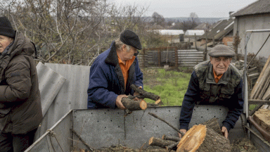 قرب محطة القطارات المدمّرة في سيفرسك في شرق أوكرانيا، يقطع فاليري شجرة بالمنشار، على غرار السكان القلائل في القرية المدمّرة من الضربات الروسية، من أجل تخزين الحطب بغية "الصمود" في فصل الشتاء.