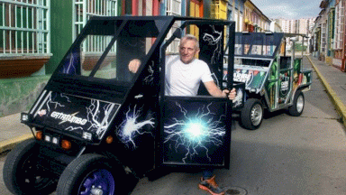 ابتكر المُخرج أوغوستو براديلي سيارة يدوية الصنع تعمل بالطاقة الشمسية يواجه بها أزمة شحّ البنزين وانقطاع التيار الكهربائي في بلده فنزويلا المنتج للنفط والذي يعاني أزمة اقتصادية حادة.