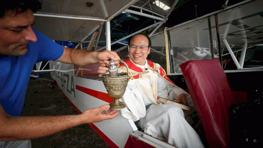 يستقل كاهن في منطقة مواساك الواقعة جنوب غرب فرنسا طائرة صغيرة ذات لونين مرتدياً ثوبه الأبيض، ويحلق فوق أجراس كنائس المنطقة لإعطاء بركته على حقول المزارعين ومواشيهم