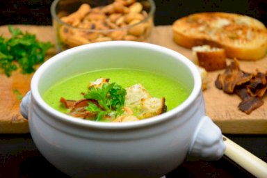 طبق اليوم حساء البازلاء الشهي مع لحم الخنزير أو الحبش المقدد، ويطيب مذاقه أكثر مع إضافة الخبز المحمّص والمكسرات.