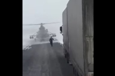 في الفيديو المنشور على الانترنت، تظهر مروحية تحلّق على مسافة قريبة جداً من طريق ثلجي، وشاحنة على الطريق نفسه. فجأة يحطّ الطيار بمروحيّته ويترجّل منها ويسير نحو سائق الشاحنة. وبعد محادثة قصيرة، يعود إلى مروحيّته ويقلع مجددًا.