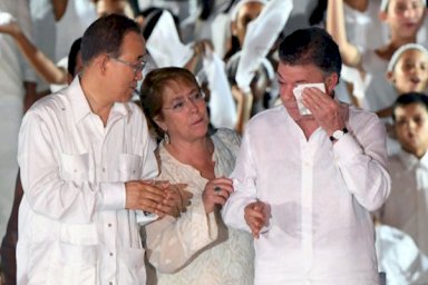 منح الرئيس الكولومبي خوان مانويل سانتوس الجمعة جائزة نوبل للسلام، تكريمًا لجهوده في إنهاء خمسة عقود من الحرب في بلاده، رغم رفض الناخبين الكولومبيين اتفاق السلام التاريخي الذي وقعه مع القوات المسلحة الثورية (فارك).