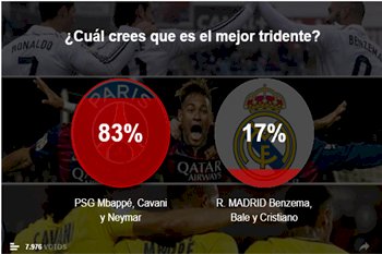 نظمت صحيفة "ماركا" إستطلاعا قبل إقامة المباراة المرتقبة بين ريال مدريد الإسباني وباريس سان جيرمان الفرنسي في ذهاب الدور الثمن النهائي لبطولة دوري أبطال أوروبا بهدف الاختيار بين الثلاثي الهجومي الافضل.